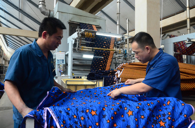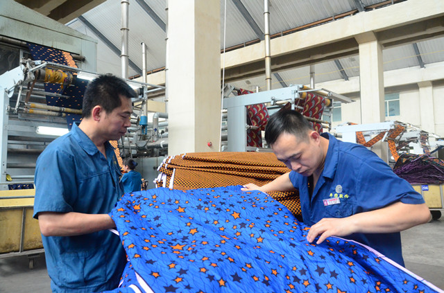 圖為公司花布車間蒸化機(jī)兩名員工在查看下機(jī)產(chǎn)品質(zhì)量。