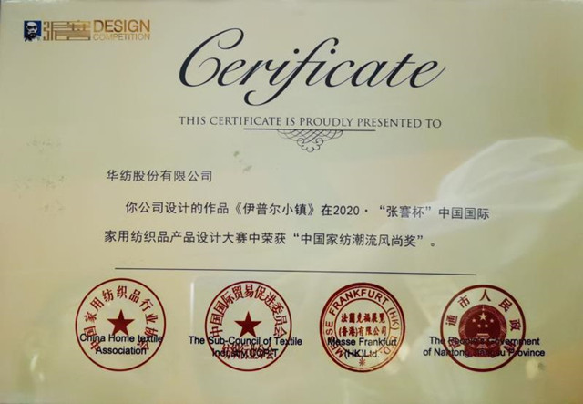 導(dǎo)讀:9月2日,以“潮流·生活”為主題的2020·“張謇杯”中國國際家用紡織品產(chǎn)品設(shè)計(jì)大賽頒獎盛典在江蘇南通舉行。公司家紡作品《伊普爾小鎮(zhèn)》,榮獲“中國家紡潮流風(fēng)尚獎”。