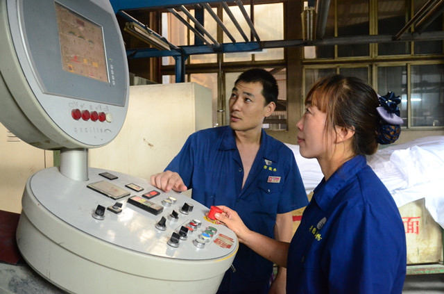圖為面一車間拉幅預縮精益生產(chǎn)承包小組副組長孫新強(左)、預縮機機長郭芳,在預縮機操作臺前準備開車生產(chǎn)的情形。