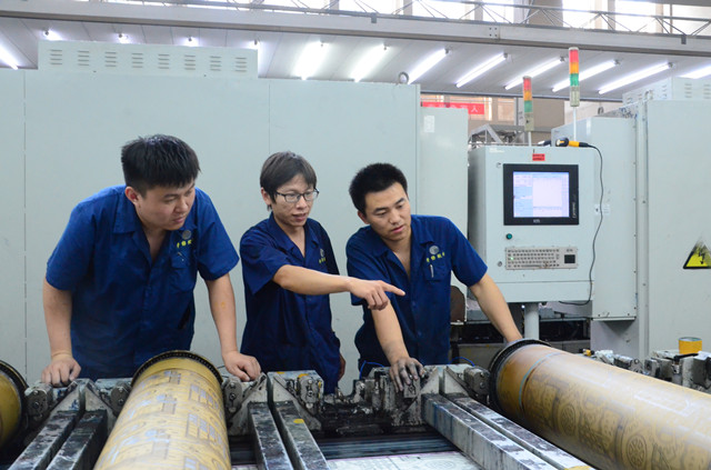 圖為輪班長(zhǎng)張楠楠(中)與本班兩位印花機(jī)擋車(chē)工,在現(xiàn)場(chǎng)討論質(zhì)量改進(jìn)的情形。