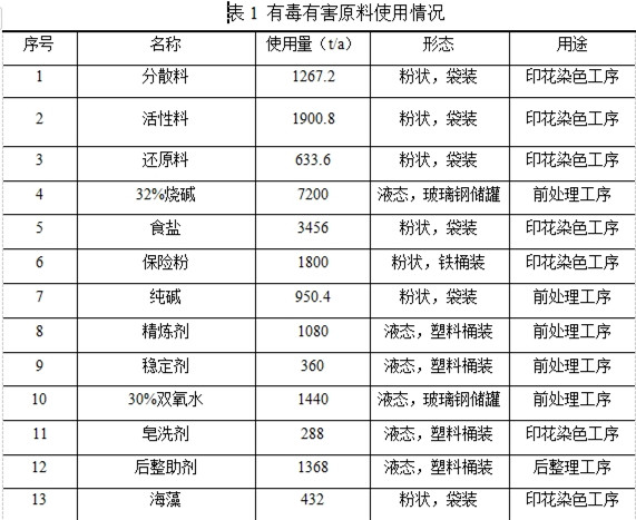 華紡股份有限公司現(xiàn)有項(xiàng)目使用的原料包括分散料、活性料、還原料、燒堿、保險(xiǎn)粉、純堿、精煉劑、穩(wěn)定劑等,其使用情況見表1。