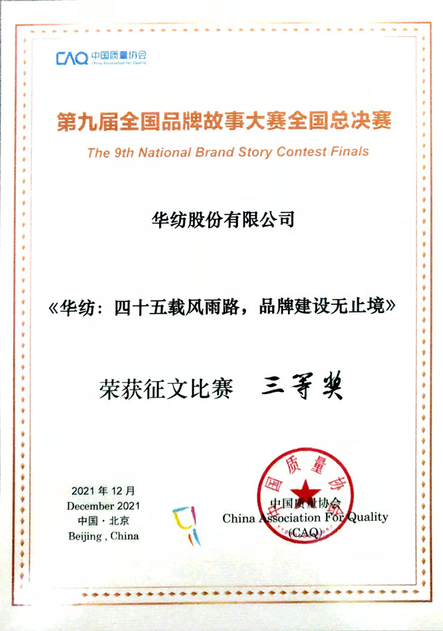 導讀:日前,第九屆全國品牌故事大賽落下帷幕,各獎項均有歸屬。公司文化中心陳光娥撰寫的征文作品《華紡:四十五載風雨路,品牌建設無止境》榮獲三等獎。