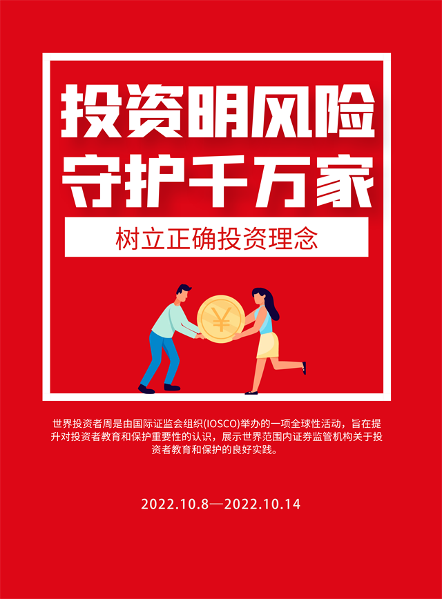 2022年“世界投資者周”將圍繞“投資明風(fēng)險,守護(hù)千萬家”主題,向投資者普及《期貨和衍生品法》、普及綠色金融、綠色投資理念,引導(dǎo)投資者閱讀上市公司定期報告、踐行以信息披露為核心的注冊制理念,向投資者傳播金融證券知識,提示投資風(fēng)險,增強理性投資、價值投資、長期投資、風(fēng)險防范意識,引導(dǎo)投資者樹立正確投資理念。
