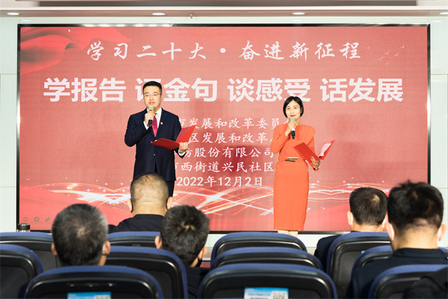 為持續(xù)深入學(xué)習(xí)領(lǐng)會(huì)、全面準(zhǔn)確把握黨的二十大精神,12月2日,濱州市發(fā)展改革委聯(lián)合濱城區(qū)發(fā)展和改革局、華紡股份有限公司、市西街道興民社區(qū)舉辦“學(xué)習(xí)二十大·奮進(jìn)新征程·學(xué)報(bào)告、誦金句、談感受、話發(fā)展”活動(dòng)。團(tuán)市委副書(shū)記丁寶冬、華紡股份有限公司黨委委員、人力行政總監(jiān)孫玉濤出席活動(dòng)。市發(fā)展改革委、濱城區(qū)發(fā)展和改革局、華紡股份有限公司、興民社區(qū)黨員代表參加活動(dòng)。