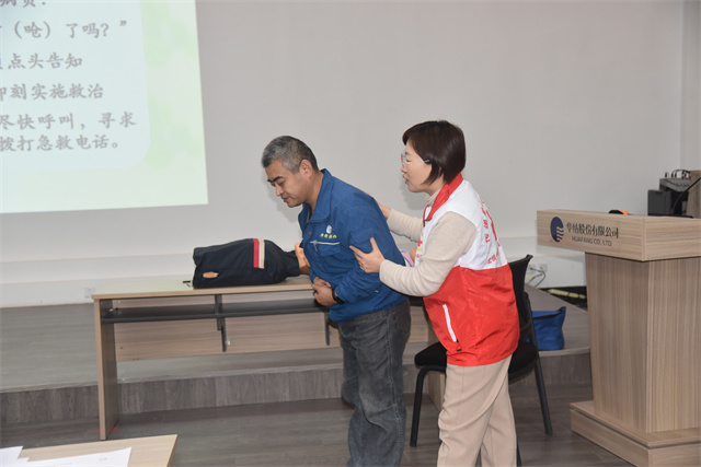 培訓(xùn)課上,王燕老師首先介紹了紅十字運(yùn)動(dòng)的基本知識(shí),隨后重點(diǎn)針對(duì)日常生活中較為常見(jiàn)的意外事故,向在場(chǎng)員工詳細(xì)講解,并演示了創(chuàng)傷救護(hù)、氣道異物梗阻急救、海姆立克急救法、心肺復(fù)蘇及包扎固定等急救技能和相關(guān)知識(shí)。