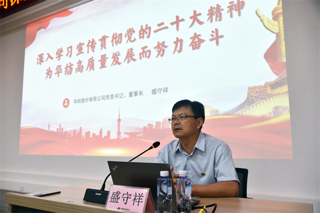 盛守祥指出,黨的二十大是在全黨全國(guó)各族人民邁上全面建設(shè)社會(huì)主義現(xiàn)代化國(guó)家新征程、向第二個(gè)百年奮斗目標(biāo)進(jìn)軍的關(guān)鍵時(shí)刻召開(kāi)的一次十分重要的大會(huì),是一次高舉旗幟、凝聚力量、團(tuán)結(jié)奮進(jìn)的大會(huì)。大會(huì)回顧總結(jié)了過(guò)去五年的工作和新時(shí)代十年的偉大變革,闡述了開(kāi)辟馬克思主義中國(guó)化時(shí)代化新境界、中國(guó)式現(xiàn)代化的中國(guó)特色和本質(zhì)要求等重大問(wèn)題,對(duì)全面建設(shè)社會(huì)主義現(xiàn)代化國(guó)家、全面推進(jìn)中華民族偉大復(fù)興進(jìn)行了戰(zhàn)略部署。也為我們?nèi)A紡事業(yè)高質(zhì)量發(fā)展指明了前進(jìn)方向。華紡作為中國(guó)紡織印染行業(yè)重要骨干力量,將堅(jiān)決貫徹黨的二十大精神,牢牢把握新時(shí)代新征程黨的使命任務(wù),自覺(jué)把責(zé)任擔(dān)當(dāng)放在心上、扛在肩上,以高質(zhì)量發(fā)展為目標(biāo),踔厲奮發(fā)推進(jìn)高水平現(xiàn)代化企業(yè)建設(shè)。