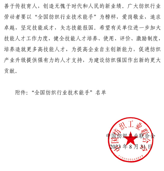 導(dǎo)讀:近日,中國紡織工業(yè)聯(lián)合會(huì)發(fā)布了授予在2023年全國紡織行業(yè)勞動(dòng)技能競賽中取得前18名的紡織企業(yè)員工為“全國紡織行業(yè)技術(shù)能手”榮譽(yù)稱號(hào)的決定,