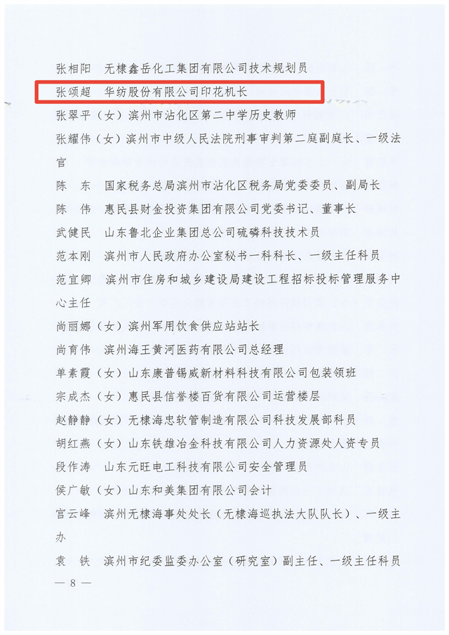 近日,濱州市總工會發(fā)布了“關于2023年濱州市五一勞動獎和濱州市工人先鋒號的通報”,對獲得濱州市五一勞動獎狀的無棣鑫岳燃化有限公司等26個單位,獲得濱州市五一勞動獎章的丁濤等190名個人,獲得濱州市工人先鋒號的濱州中裕食品有限公司面條三車間等30個集體予以通報表揚。其中,公司花布車間印花機機長張頌超榮獲2023年濱州市五一勞動獎章。
