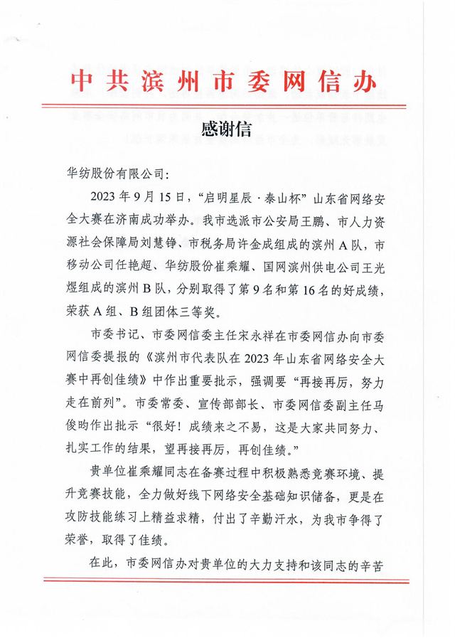 近日,公司收到一封來(lái)自濱州市委網(wǎng)信辦的感謝信,信中高度肯定了公司互聯(lián)信息部信息中心信息安全管理員崔乘耀在2023年9月15日“啟明星辰·泰山杯”山東省網(wǎng)絡(luò)安全大賽中所做出的突出貢獻(xiàn),信中指出:“貴單位崔乘耀同志在備賽過(guò)程中積極熟悉競(jìng)賽環(huán)境、提升競(jìng)賽技能,全力做好線下網(wǎng)絡(luò)安全基礎(chǔ)知識(shí)儲(chǔ)備,更是在攻防技能練習(xí)上精益求精,付出了辛勤汗水,為我市爭(zhēng)得了榮譽(yù),取得了佳績(jī)。”