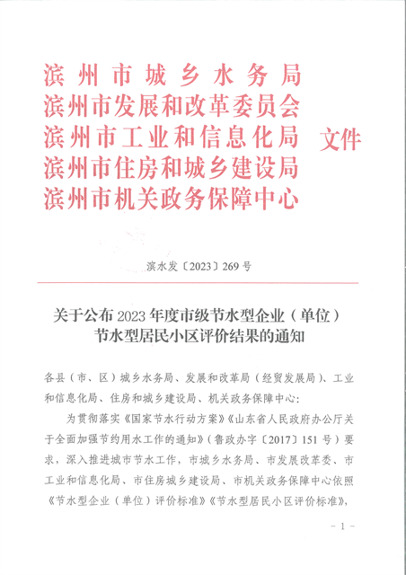 近日,濱州市城鄉(xiāng)水務(wù)局、濱州市發(fā)展和改革委員會、濱州市工業(yè)和信息化局、濱州市住房和城鄉(xiāng)建設(shè)局、濱州市機關(guān)政務(wù)保障中心發(fā)布了《關(guān)于公布2023年度市級節(jié)水型企業(yè)(單位)、節(jié)水型居民小區(qū)評價結(jié)果的通知》,經(jīng)綜合評價,公司達(dá)到市級節(jié)水型企業(yè)(單位 )、節(jié)水型居民小區(qū)標(biāo)準(zhǔn)要求,獲評2023年度濱州市節(jié)水型企業(yè)。