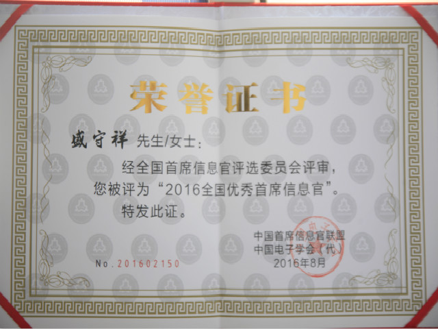 導(dǎo)讀:日前,中國首席信息官聯(lián)盟、中國電子學(xué)會對2016年度全國優(yōu)秀首席信息官評審結(jié)果進(jìn)行了表彰,公司副總經(jīng)理盛守祥以在推進(jìn)數(shù)字華紡智慧華紡建設(shè)方面的卓異業(yè)績,獲得這一殊榮。