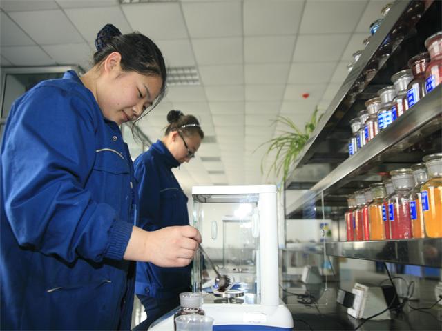 圖為公司花二車間技術(shù)人員在進(jìn)行顏色配比。