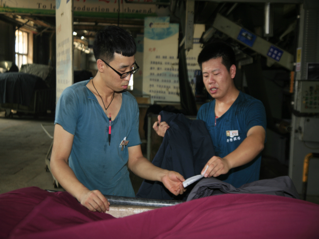 面三車(chē)間陳萬(wàn)龍(圖右)在與本車(chē)間后處理預(yù)縮機(jī)機(jī)長(zhǎng)王巖軍核對(duì)完試驗(yàn)布數(shù)據(jù)后,說(shuō):“氣溫高,我們的勞動(dòng)熱情更高!”