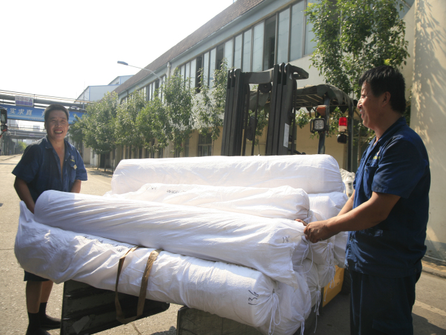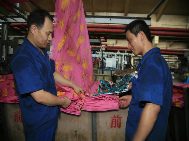 家紡車(chē)間前處理340絲光機(jī)出檢工李娟(圖左)與前來(lái)推布的360拉幅機(jī)進(jìn)檢工朱濤交接產(chǎn)品。李娟說(shuō):“天氣越熱,我們?cè)揭ハ嗵崾?,注重?xì)節(jié),保證安全,保證品質(zhì)。”