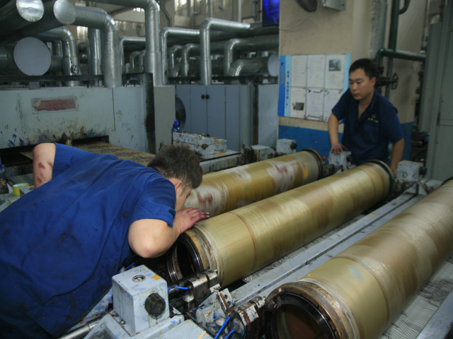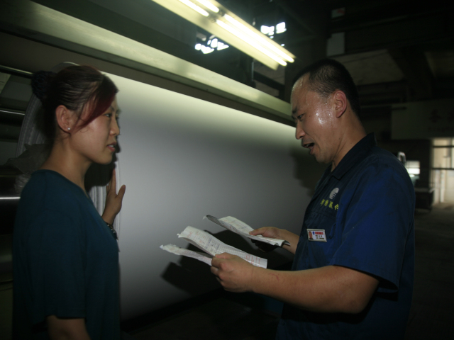 花一車(chē)間后處理技術(shù)員張延軍(圖右)與軋光機(jī)機(jī)長(zhǎng)吳秀祝在交流生產(chǎn)情況。他倆表示,每一米優(yōu)質(zhì)產(chǎn)品都是靠專(zhuān)注認(rèn)真干出來(lái)的。