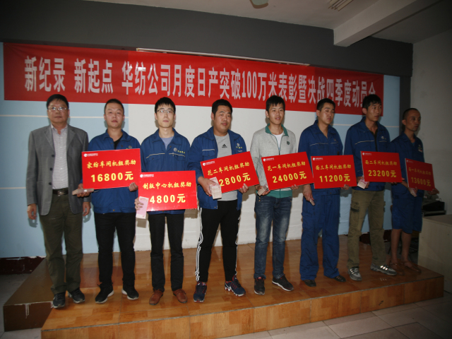 10月11日,公司召開主題為“新紀錄,新起點,華紡公司月度日產突破100萬米表彰暨決戰(zhàn)四季度動員會”,會上對在9月份印染生產計劃完成工作中成績優(yōu)異的55個機組和41位個人進行了表彰獎勵,對第四季度工作進行了部署。