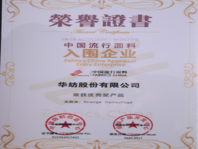 日前,由中國(guó)紡織工業(yè)聯(lián)合會(huì)主辦的中國(guó)國(guó)際面料設(shè)計(jì)大賽、中國(guó)生態(tài)環(huán)保面料設(shè)計(jì)大賽活動(dòng)圓滿結(jié)束,公司在大賽中取得可喜成績(jī),分別榮獲“2018/2019秋冬中國(guó)流行面料入圍企業(yè)”、“2017第二屆中國(guó)生態(tài)環(huán)保面料創(chuàng)新企業(yè)”榮譽(yù)稱號(hào)。