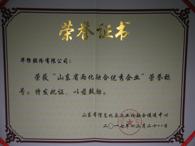 2017年12月28日,山東省信息化與工業(yè)化融合促進中心公開表彰了“山東省兩化融合優(yōu)秀企業(yè)”,公司以近年來在兩化融合方面的卓越表現(xiàn),榮登這一榜單。