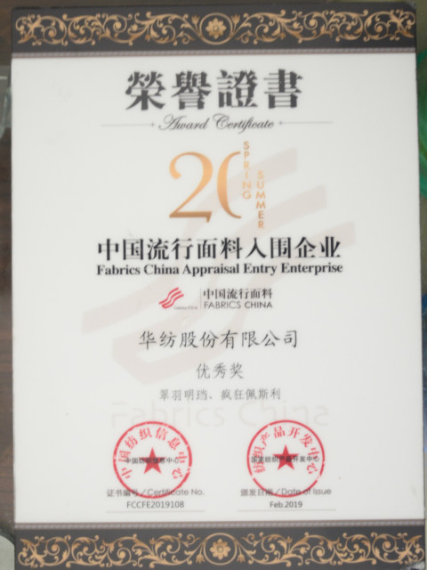 導讀:在剛剛結(jié)束的2019中國國際面料設(shè)計大賽、第41屆(2020春夏)中國流行面料入圍評審活動中,公司榮獲“2020春夏中國流行面料入圍企業(yè)”稱號。